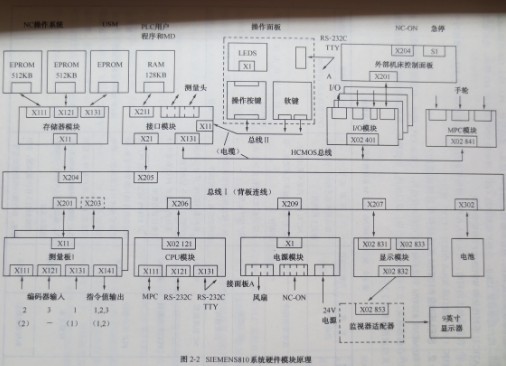?SIEMENS 810T/M系統(tǒng)的硬件結(jié)構(gòu)緊湊,整體體積僅相當(dāng)于放一臺(tái)14英寸電視機(jī)。圖2-1為系統(tǒng)背面示意圖,主要部件原理框圖如圖2-2所示。